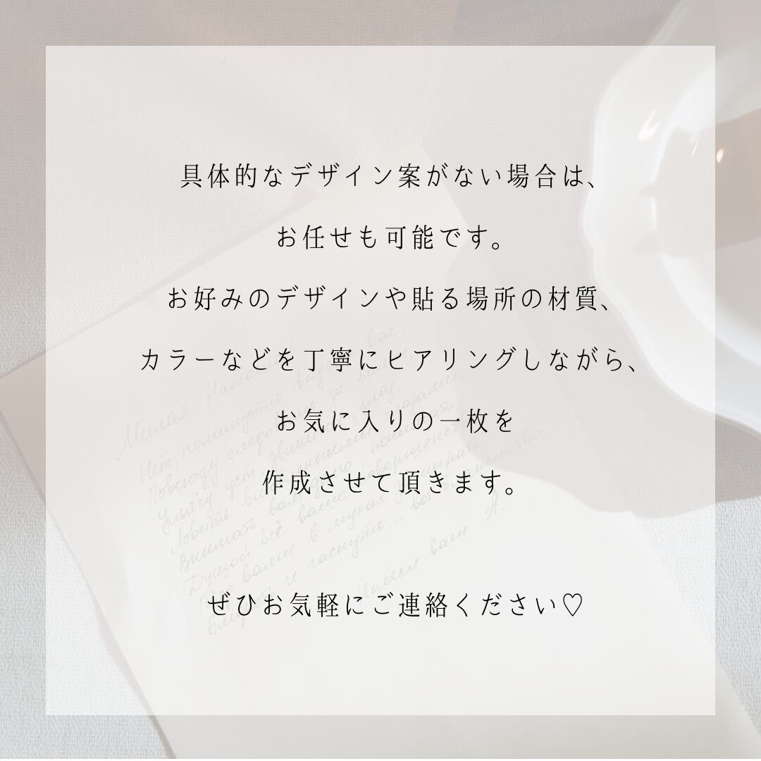 お好みのデザインや貼る場所の材質、カラーなどを丁寧にヒアリングし、お気に入りのステッカーを作製させて頂きます。